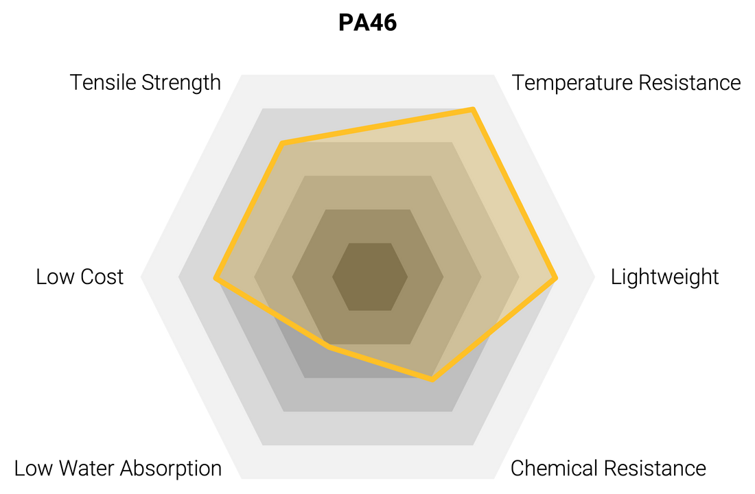 Polyamide 46 (PA46) is a high-performance thermoplastic known for its exceptional thermal stability, mechanical strength, and wear resistance. It can withstand prolonged exposure to elevated temperatures, making it ideal for demanding applications in automotive engines, industrial machinery, and electrical components. PA46 exhibits excellent dimensional stability and resistance to chemicals and moisture, ensuring reliable performance in harsh environments. These attributes make it a preferred material for components requiring durability and high performance under stress.