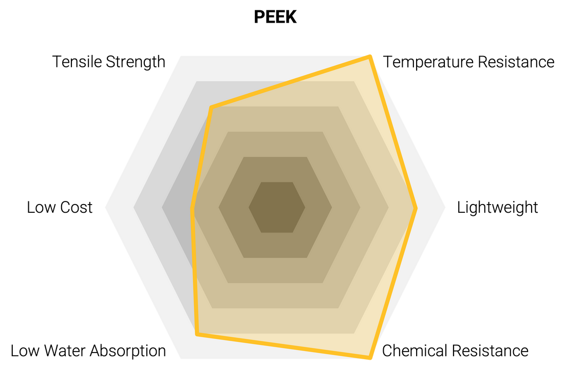 Polyether Ether Ketone (PEEK) is a high-performance thermoplastic known for its outstanding mechanical strength, thermal stability, and resistance to chemicals. It maintains excellent performance at temperatures up to 250°C and resists a wide range of harsh chemicals, including acids and solvents. PEEK also features superior wear resistance, low moisture absorption, and excellent dimensional stability. These qualities make it ideal for demanding applications in industries such as aerospace, automotive, medical devices, and industrial machinery.