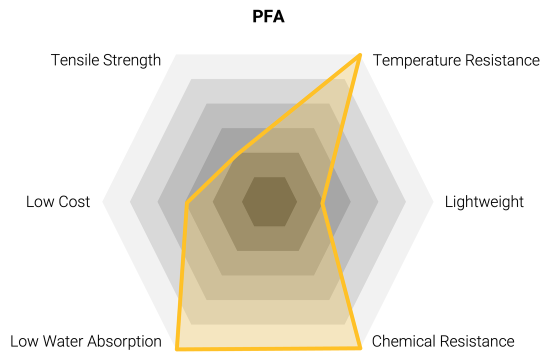 Perfluoroalkoxy (PFA) is a fully fluorinated thermoplastic known for its exceptional chemical resistance, non-stick properties, and high thermal stability. Its chemical inertness and ability to withstand aggressive chemicals and high temperatures make it ideal for semiconductor manufacturing, chemical processing, and high-performance wire insulation. These qualities, along with its flame resistance, ensure durability and reliability in demanding applications.