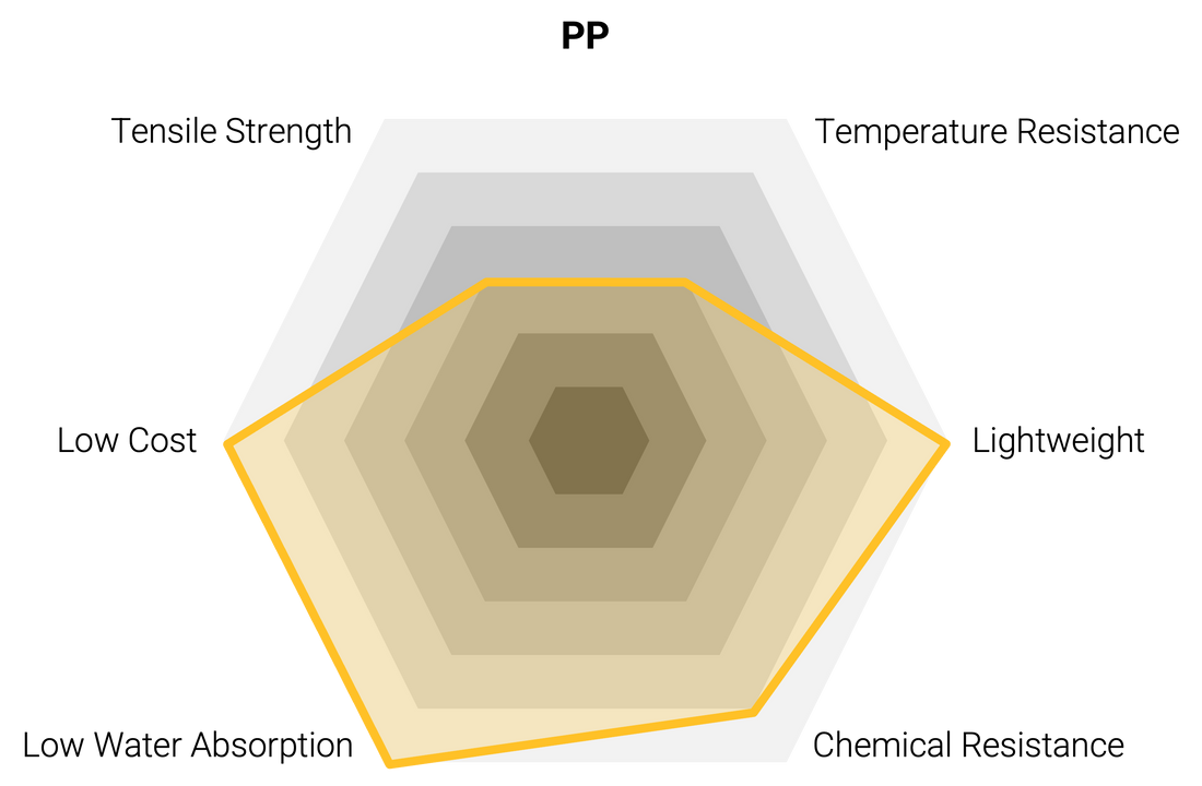 Polypropylene (PP) is a versatile thermoplastic polymer characterized by its low density, excellent chemical resistance, and high durability. It has a melting point of around 160°C, making it suitable for applications that require sterilization. PP is widely used across industries, including packaging, automotive, textiles, medical devices, and consumer goods, thanks to its strength and cost-effectiveness. Its resistance to moisture and many chemicals makes it a reliable choice for a variety of demanding applications.