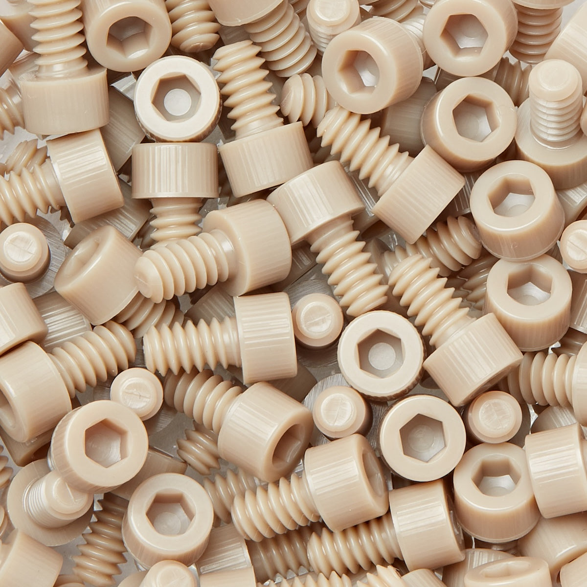 Imperial PEEK GF30 (SHCS) Socket Cap Screws - UNC (ASME B18.3), available in thread sizes from 2-56 to 1/4-20 and lengths from 3/16" to 1", are made from 30% glass fiber-reinforced Polyether Ether Ketone (PEEK). These screws offer exceptional mechanical strength, thermal stability, and chemical resistance, making them ideal for a wide range of demanding applications across aerospace, chemical processing, electronics, medical devices, and automotive industries. The combination of durability, lightweight nature, and resistance to harsh conditions ensures that PEEK GF30 socket cap screws provide reliable and long-lasting performance in critical environments.